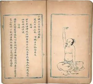 image from a Qigong manual, from the Qing dynasty, showing a seated version of the baduanjin